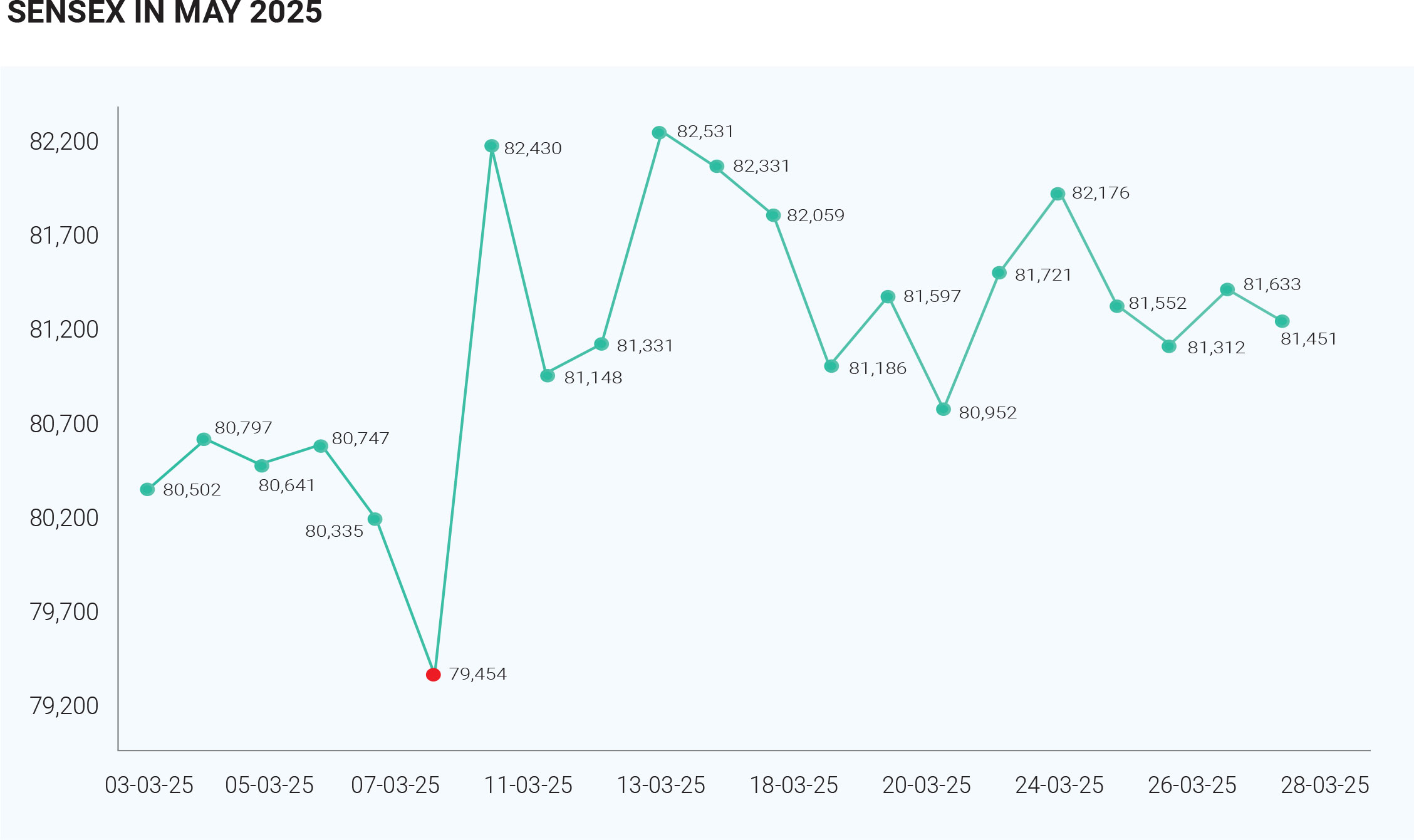 May 2025 was a month of moderation, resilience, and strategic positioning for Indian equities. After a strong rally in March and April, the NIFTY 50 and Sensex continued to post gains, but at a slower pace, amid a complex backdrop of geopolitical tensions, global trade